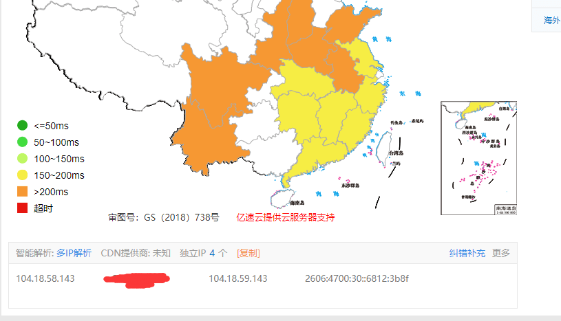 接下来可以用站长工具进行ping检测,看看解析的是不是自己的真实ip 如果不是,证明CDN成功了.由于CDN节点可能有延迟,还能解析到原ip,这是正常的,过个一段时间就好了.大概像这个样子:
