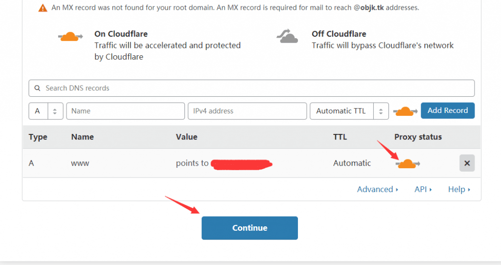 这里说明一下正常应该是两条解析记录.默认是两个橙色的云朵,不用动.
