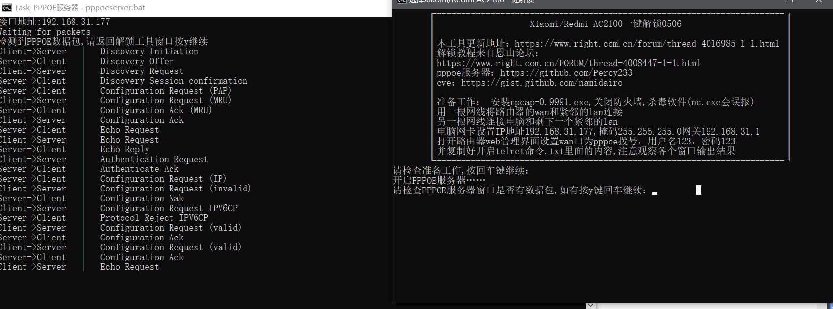 4.登录路由器后台,设置上网方式位PPOE,设置用户名123,密码123,点击拨号,然后打开一键telnet脚本,回车会看到PPOE服务的包,再返回到一键telnet脚本输入y,会出现反弹的shell,复制开启telnet命令,粘贴进去并回车,开启telnet命令如下: