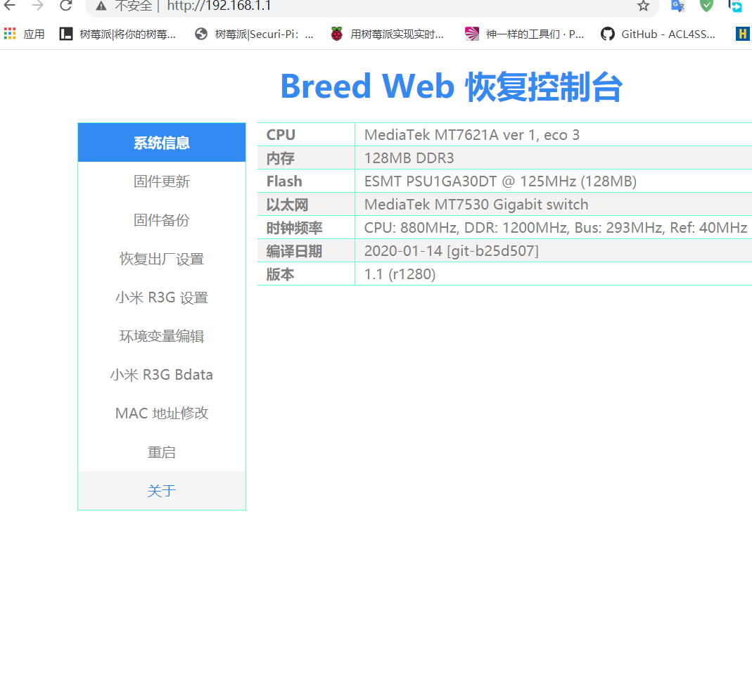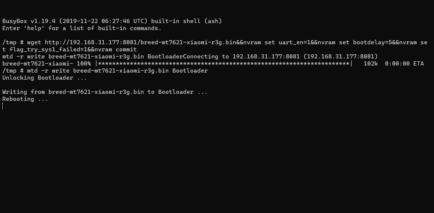 1 | wget http://192.168.31.177:8081/breed-mt7621-xiaomi-r3g.bin&&nvram set uart_en=1&&nvram set bootdelay=5&&nvram set flag_try_sys1_failed=1&&nvram commit |