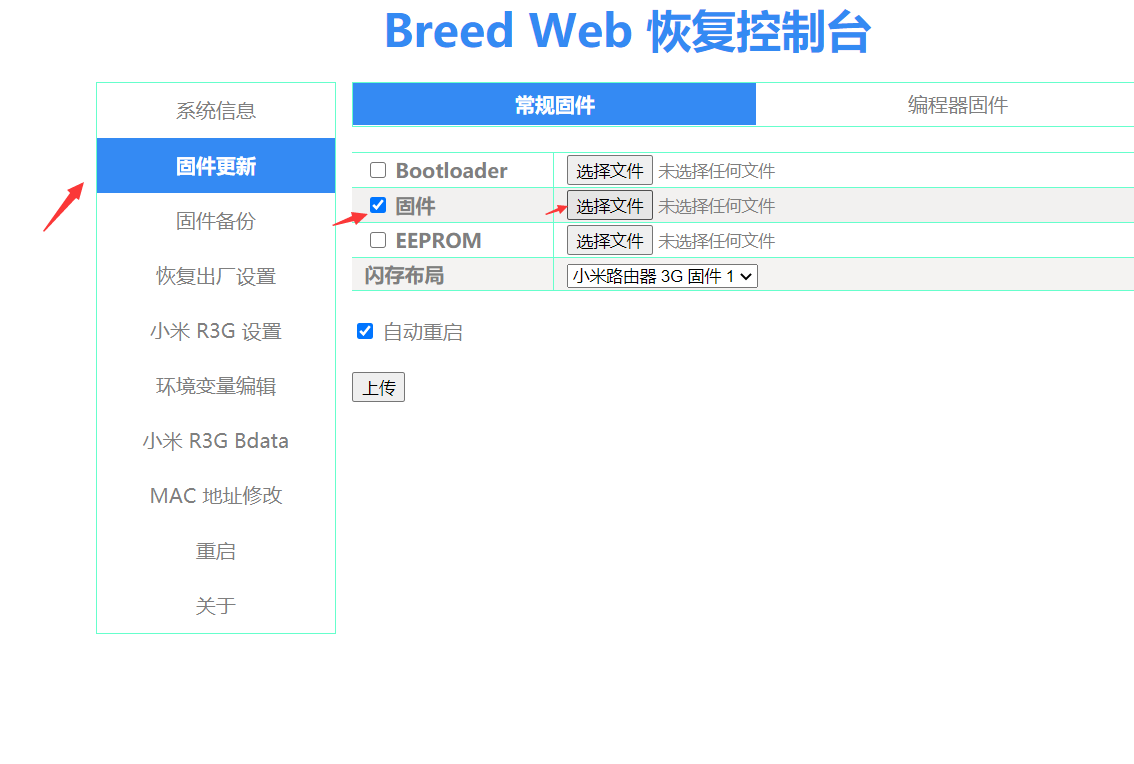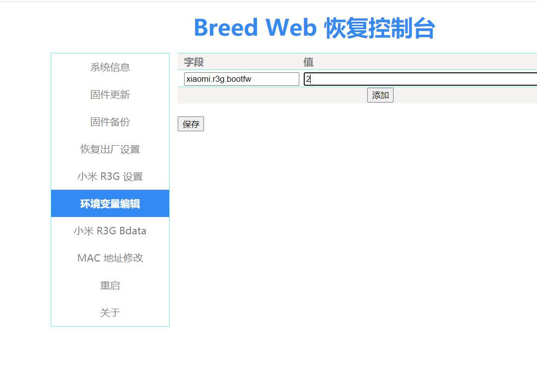 首先需要在breed后台,选择环境变量编辑,输入字段xiaomi.r3g.bootfw,值为2,并保存,再选择固件更新上传固件文件,大佬说的是用breed刷openwrt的话需要先安装过渡文件再在安装之后的后台上传需要的版本升级,一下几张图提供参考: