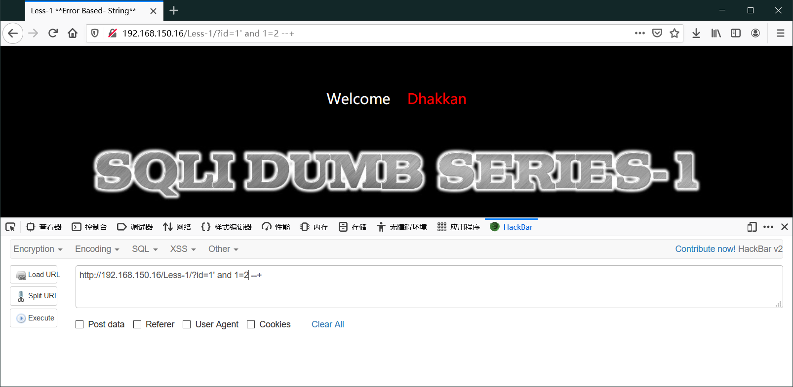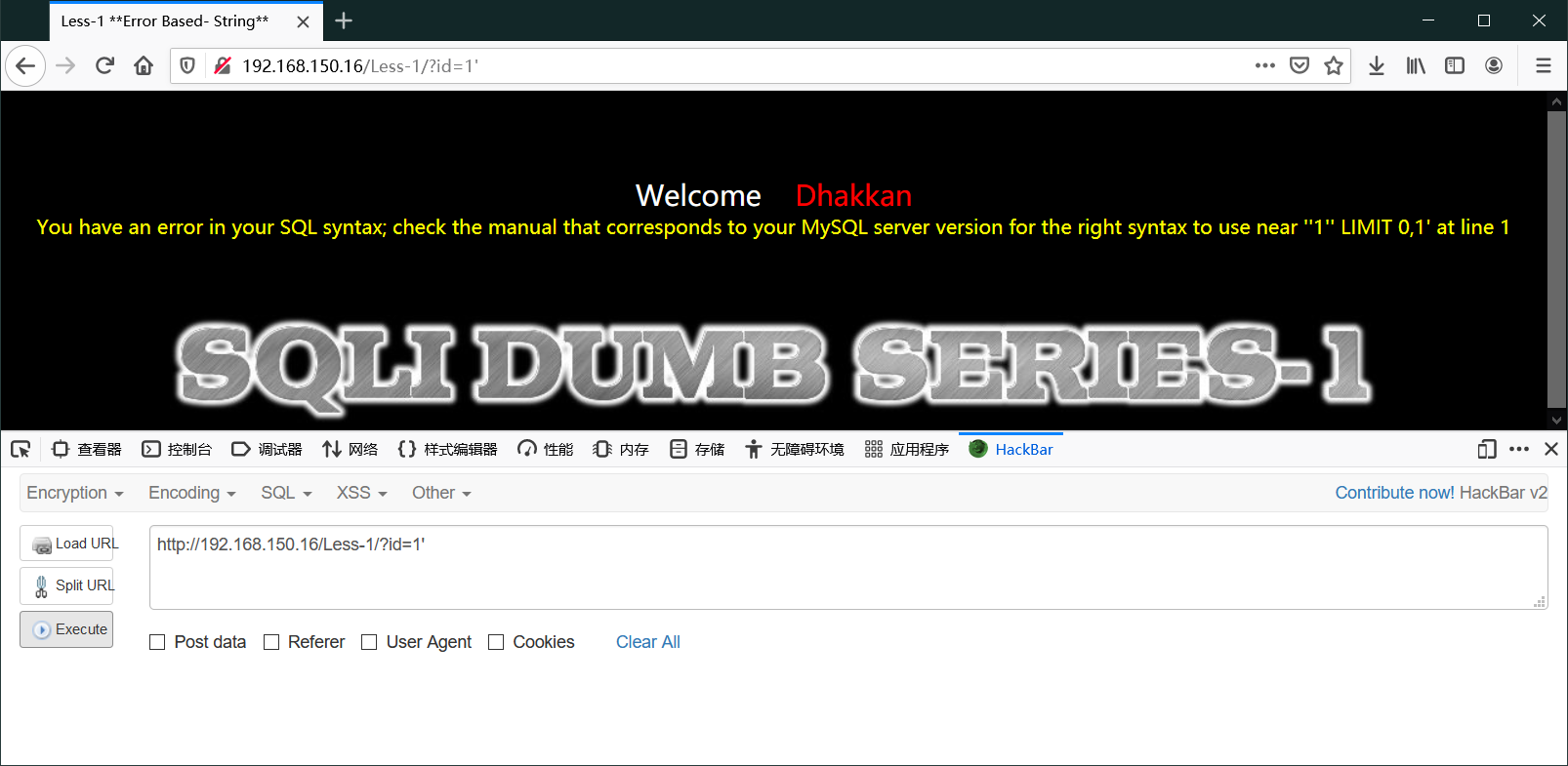 我们可以在http://192.168.150.16/Less-1/后面直接添加`?id=1'`,结果如下图: