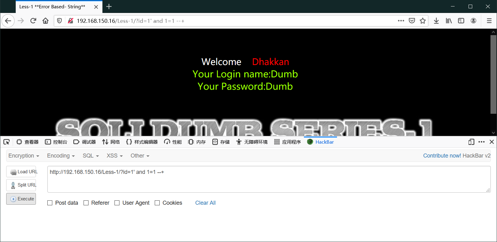 这里选择在'后面加上--+进行闭合。访问id=1 and 1=1,由于and 1=1为真,所以页面应返回与id=1相同的结果,如下图