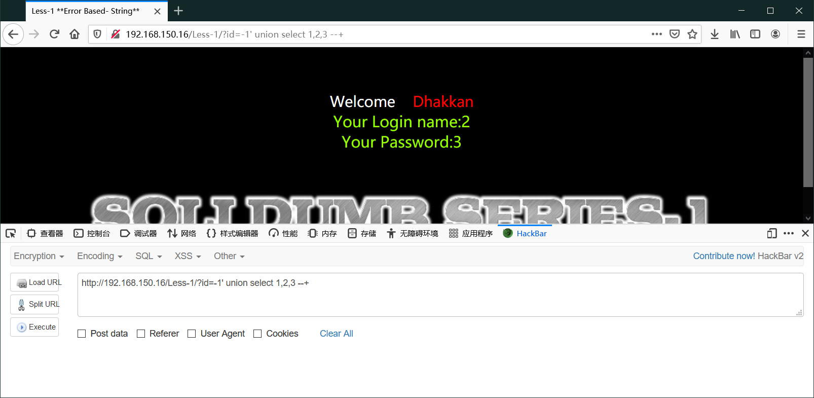 在数据库中查询参数ID对应的内容然后将数据库的内容输出到页面,由于是将数据输出到页面上的,所以可以使用Union注入,并通过order by查询结果,得到字段数为3,所以union注入的语句如下表示