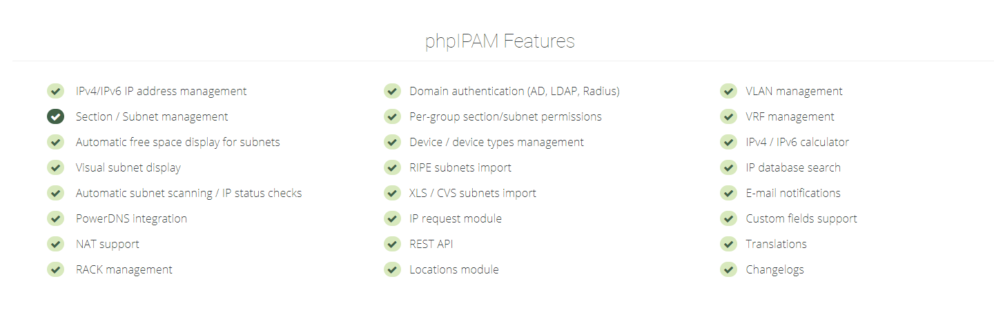 也可以通过snmp探测内网中存活主机,功能还是比较强大的,不过我只用于台账的管理。下图是phpipam所支持的功能列表: